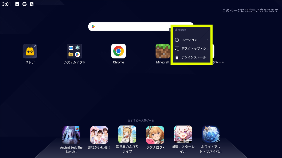 マイクラのアイコンを長押しクリックしますと、下画像黄枠のようなポップアップが出ますので、その中にあるインフォメーションをクリックします